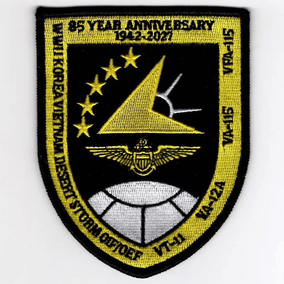 This patch celebrates the *85-YEAR* anniversary of VA/VFA-115 and lists all the conflicts the squadron has been involved in, from WWII to OIF/OEF (left) and the Squadron Designators it flew under (right). This patch does not come with velcro attached and is in very limited supply.