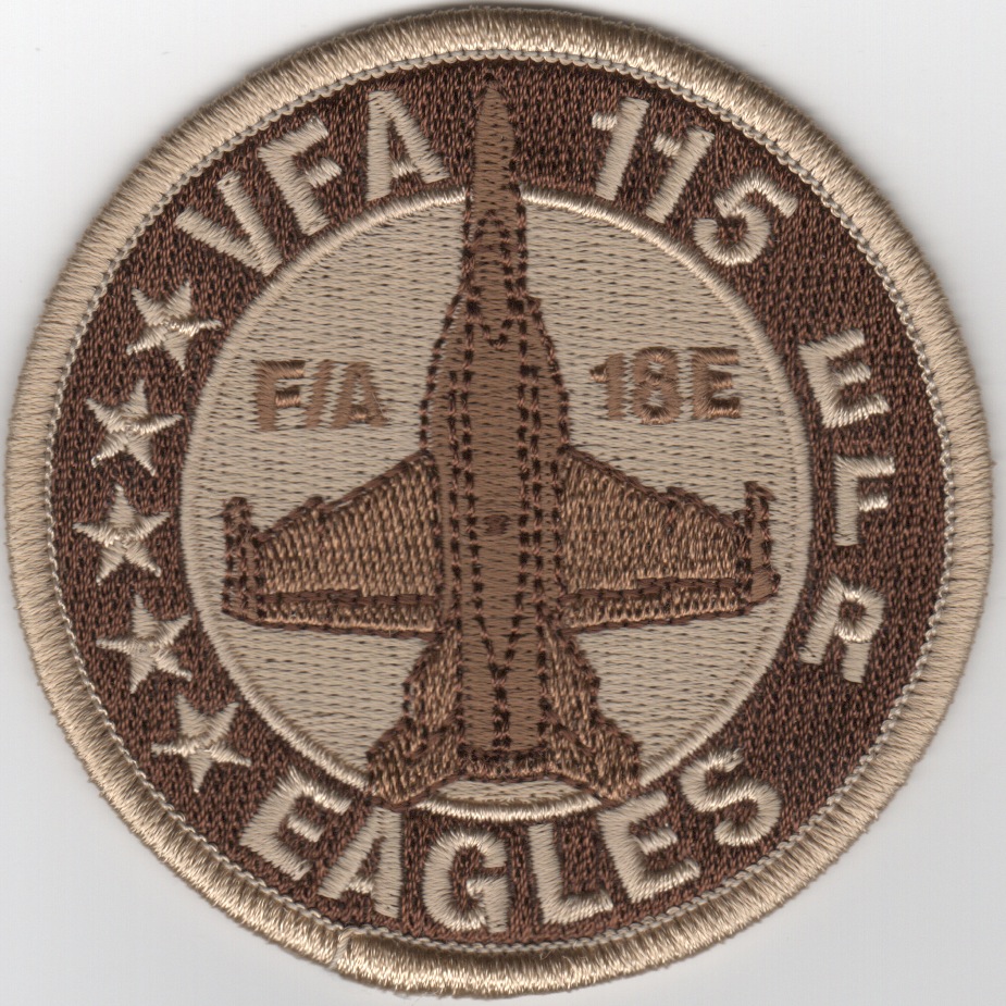 The ‘Eagles’ have a long history, beginning as Torpedo Squadron 11 in October 1942. They became VA-115 in July 1948, and for many years were nicknamed the “Arabs” until changed for obvious reasons. They also gave up their Intruders based out of NAS Whidbey Island in the early ’90s and transitioned to the F/A-18C Hornet flying out of NAS Lemoore, CA. This is the 4-Star version of their aircraft bullet patch that they wear on their right flightsuit sleeve. The stars represent the number of aircraft the unit has flown. Their first aircrafgt was the “TBF Avenger”, then they transitioned to A-1 skyraiders. During the 1960’s, they moved to A-6’s, then to the F/A-18C’s, and are now currently flying the F/A-18 ‘Super Hornet’ Rhino’s today, which is their FIFTH aircraft, hence the FIVE stars. This is the desert version of their bullet patch and does not come with velcro attached