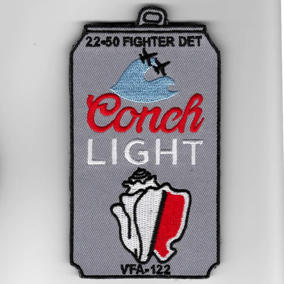 (Another AV8RSTUFF Creation): VFA-122 flies the F/A-18E/F out of NAS Lemoore, CA as the West Coast Replacement Air Group (RAG). In order to be qualified for the “FLEET” (operational squadrons), the pilots must “Air-to-Air” qualify by going through the ‘FIGHTER’ curriculum at NAS KEY WEST, FL. This is the class’ SQUADRON DET CHEST patch that says “22-50 FIGHTER DET” (top), “CONCH LIGHT” (middle with a CONCH SHELL), and “VFA-122” (bottom). This patch is in the shape/look of the ‘COORS LIGHT’ beer can and DOES come with velcro attached.
