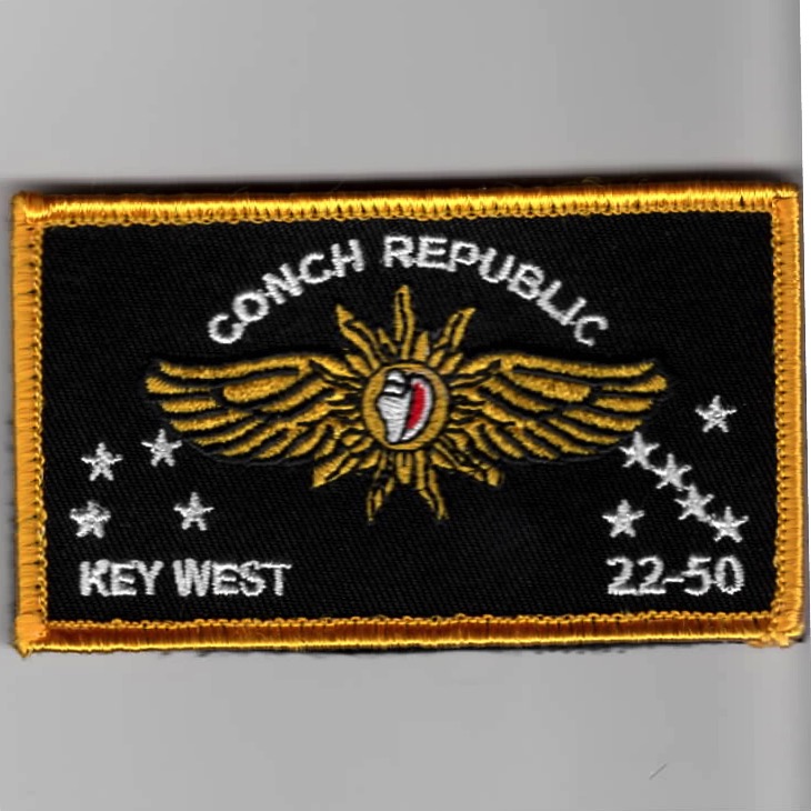 (Another AV8RSTUFF Creation): VFA-122 flies the F/A-18E/F out of NAS Lemoore, CA as the West Coast Replacement Air Group (RAG). In order to be qualified for the “FLEET” (operational squadrons), the pilots must “Air-to-Air” qualify by going through the ‘FIGHTER’ curriculum at NAS KEY WEST, FL. This is the class’ SQUADRON DET (left) SHOULDER patch that says “CONCH REPUBLIC” (top), has wings in the middle with a Conch Shell as the ‘rating’, and says “KEY WEST 22-50” (bottom). This patch DOES come with velcro attached.