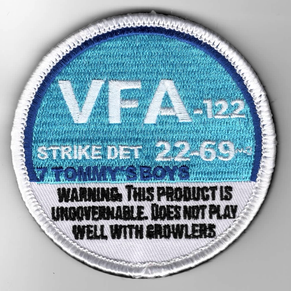(Another AV8RSTUFF Creation): VFA-122 flies the F/A-18C out of NAS Lemoore, CA as the West Coast Replacement Air Group (RAG). In order to be qualified for the “FLEET” (operational squadrons), the pilots must “WEAPONS Qualify” by going through the ‘STRIKE’ curriculum at El Centro NAF, CA. This is the class’ SHOULDER DET patch says “7 TOMMY’S BOYS” (middle) with a funny quip at the bottom. This patch has the “blue” overtones and DOES come with velcro attached.