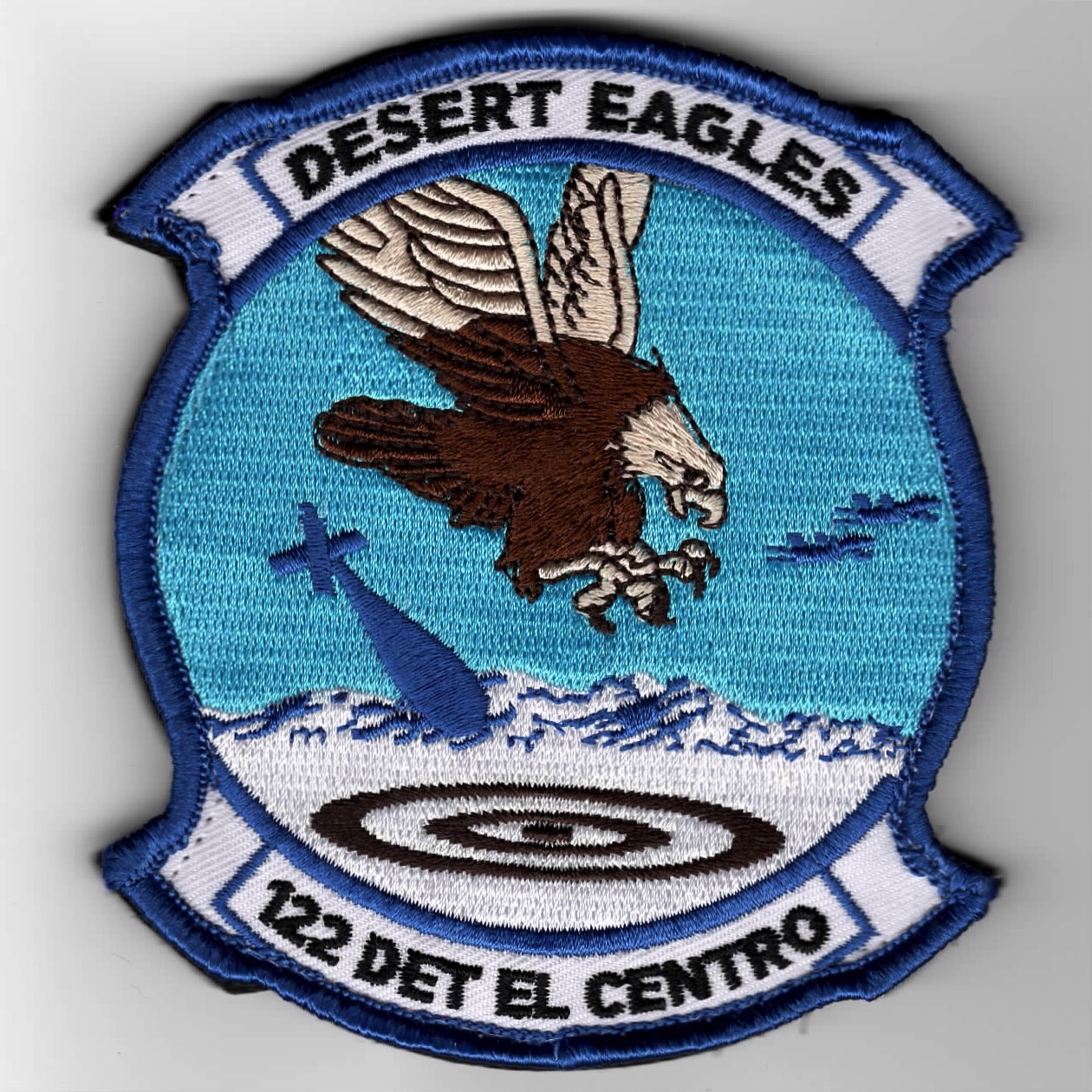 (Another AV8RSTUFF Creation): VFA-122 flies the F/A-18C out of NAS Lemoore, CA as the West Coast Replacement Air Group (RAG). In order to be qualified for the “FLEET” (operational squadrons), the pilots must “WEAPONS Qualify” by going through the ‘STRIKE’ curriculum at El Centro NAF, CA. This is the class’ SQUADRON DET patch says “DESERT EAGLES” (top) and “122 DET EL CENTRO” (bottom). This patch has the “blue” overtones and DOES come with velcro attached.