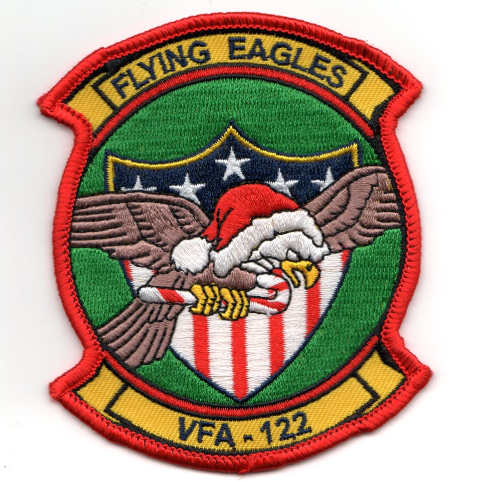 (Another AV8RSTUFF Creation): This is the squadron ‘CHRISTMAS’ patch created for VFA-122 flying the F/A-18C out of NAS Lemoore, CA. Strike Fighter Squadron 122 (VFA-122), also known as the “Flying Eagles”, are a USN F/A-18E/F Super Hornet and F/A-18 Hornet Fleet Replacement Squadron (FRS). This patch was created for their 2020 Christmas Celebration and does not come with velcro attached.