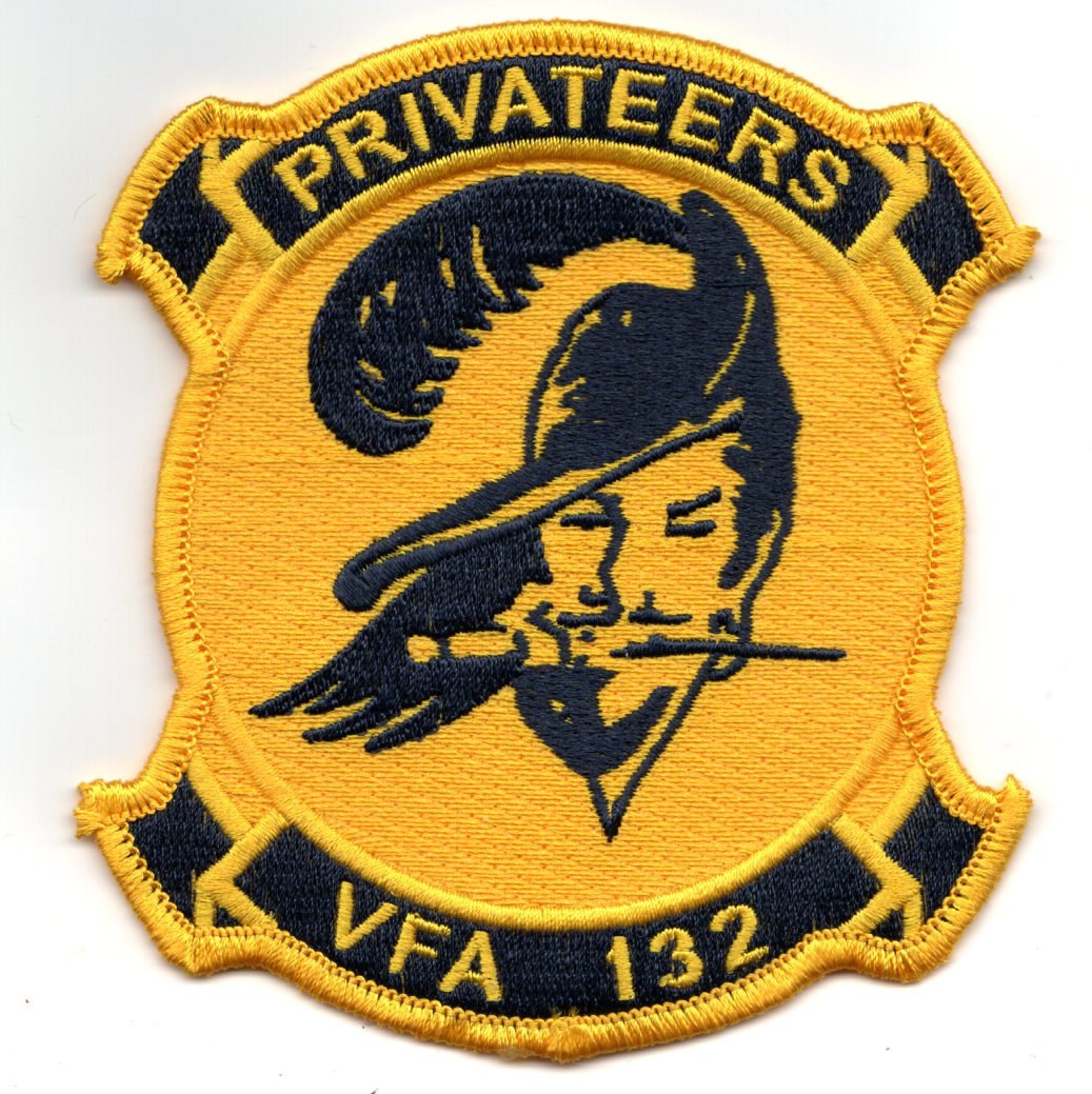 VFA-132 was established on 3 January 1984, operating the F/A-18C Hornet from NAS Lemoore, CA. They made their inaugural deployment aboard the USS Coral Seal (which was retired in 1989) and saw combat operations during the Operations Prairie Fire and El Dorado Canyon against Libya. They transitioned to the USS Forrestal upon return, then were decommissioned themselves when the USS Forrestal became the Navy’s training carrier in 1992. This is one of the “old” versions of their squadron patch showing the *PRIVATEER* (which is a fancy name for BUCCANEER), and does not come with velcro attached.