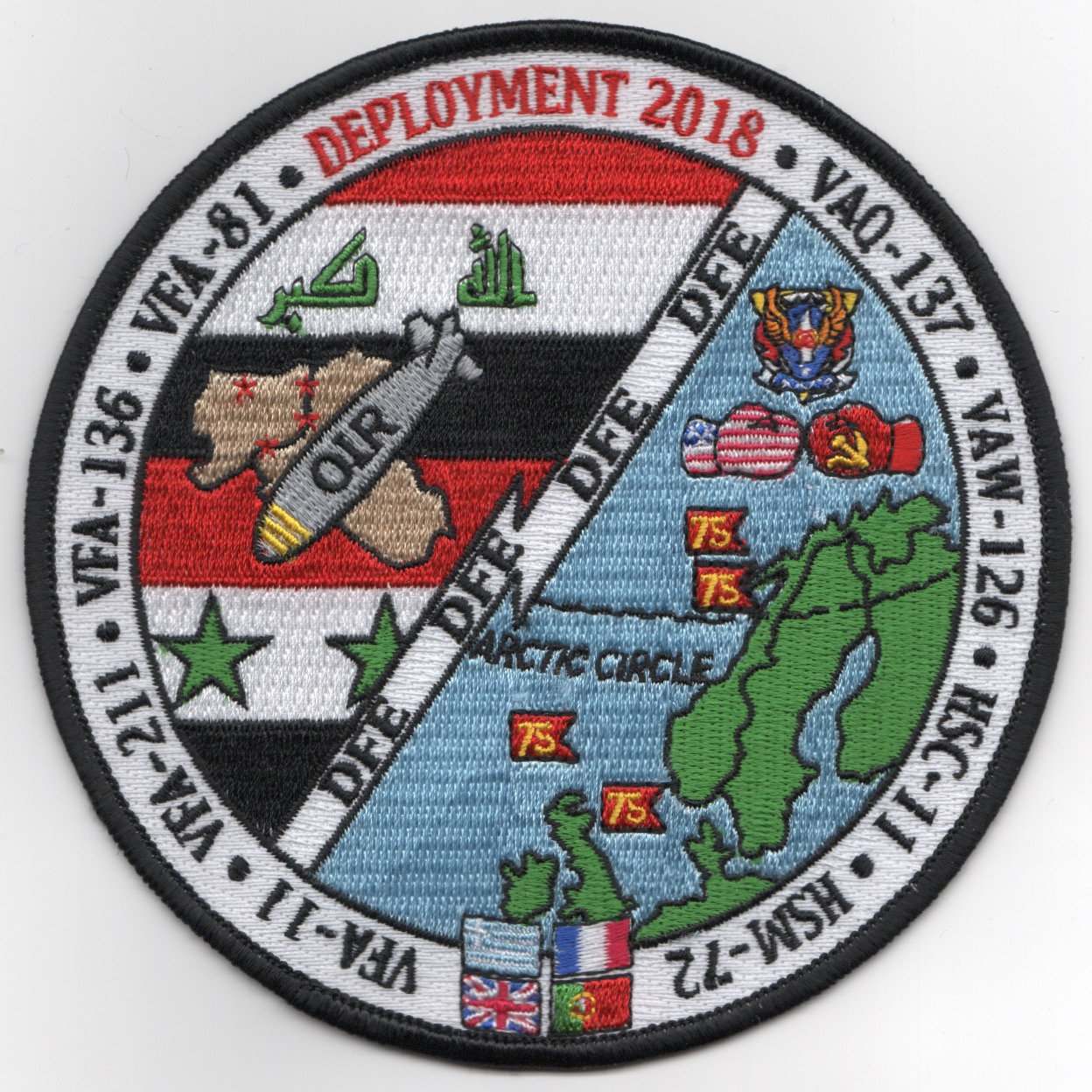 This is one of the 2018 Cruise patches for VFA-136 for the support in Operation INHERENT RESOLVE (OIR) and shows the countries of Iraq and Syria on the left, with the Artic Circle on the right, with DFE – DFE – DFE – DFE bisecting the middle (not sure what DFE means). This patch does not have velcro attached.