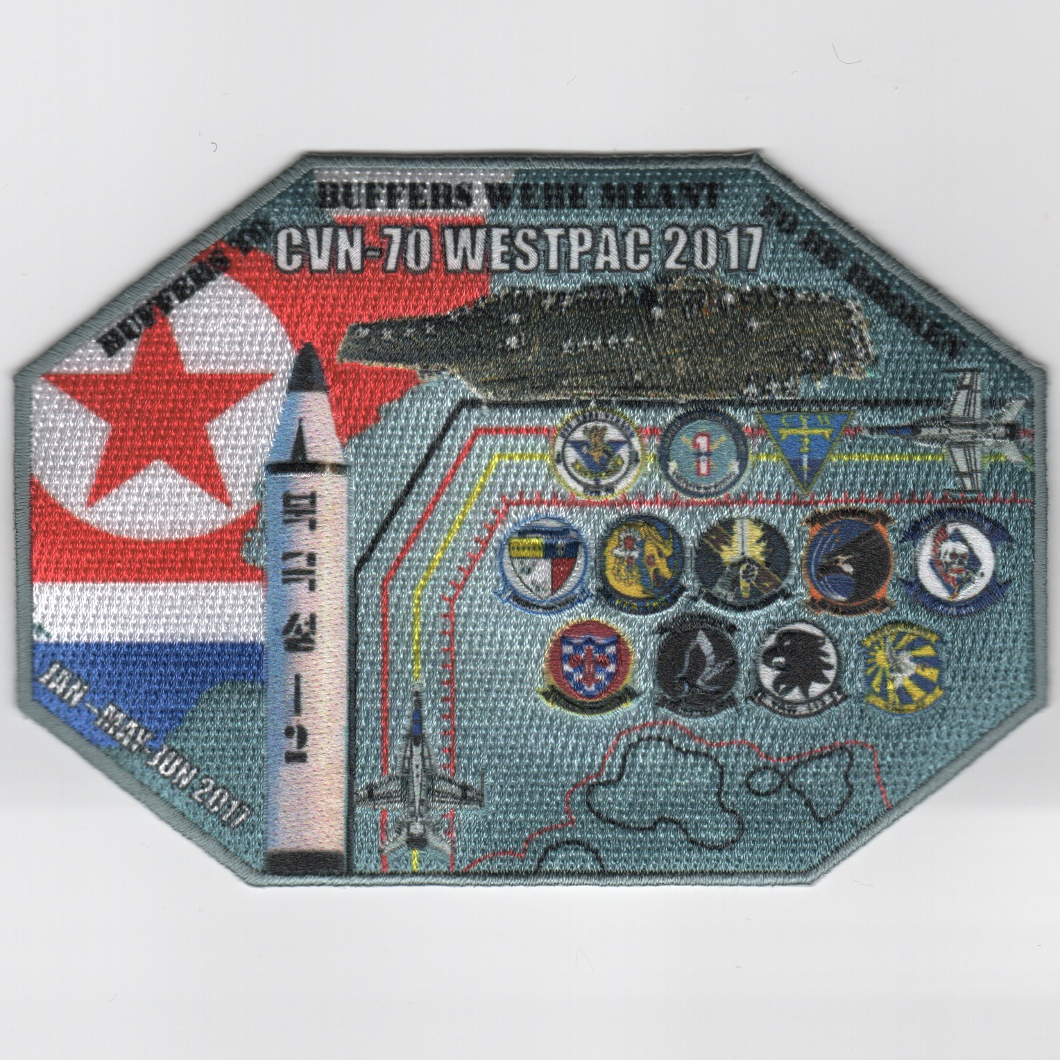 This is another creation by AV8RSTUFF for the Kestrels for their 2017 WestPac deployment onboard the USS Carl Vinson (CVN-70). This patch shows the North Korean (NOKO) flag and missile on the left side, with the carrier and the “gaggle” of squadron logos on the right. It uses the “hybrid” technology to give the greatest detail!! Amazing patch! It does not have velcro on the back.