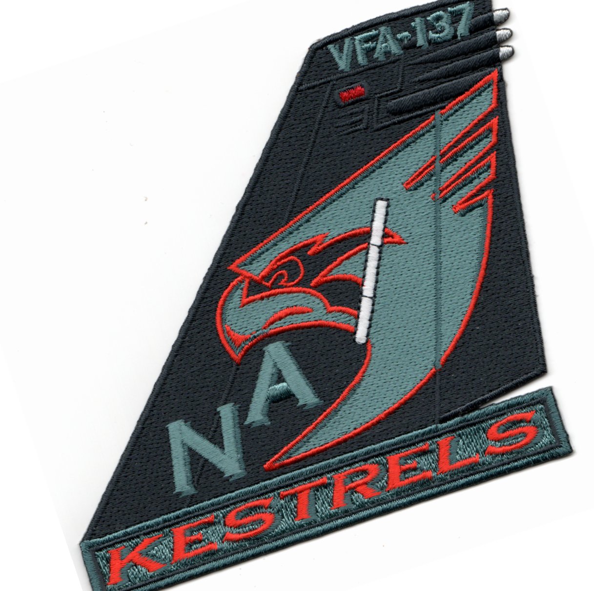 (Another AV8RSTUFF Creation): The “Kestrels” were established in July 1985 and operate the F/A-18E Hornet. Originally attached to CVW-6 onboard the USS Forrestal (CV-59), they left their East Coast base (NAS Cecil Field, FL) and became the sister squadron of VFA-151 stationed at NAS Lemoore Field, CA. This version of their tailfin has the “Glow In The Dark” (GITD) form lights with ‘NA’ on their tailfin and also depicts their mascot, the Kestrel. This patch does not have velcro attached.