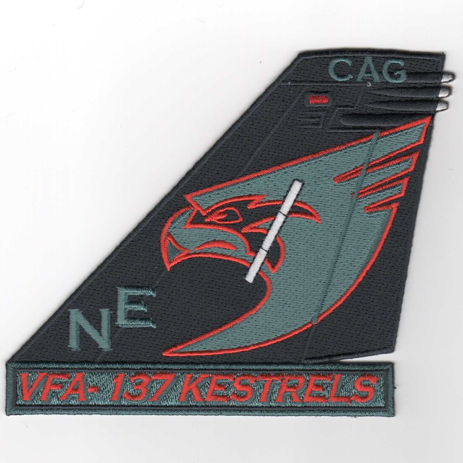 (Another AV8RSTUFF Creation): The “Kestrels” were established in July 1985 and operate the F/A-18E Hornet. Originally attached to CVW-6 onboard the USS Forrestal (CV-59), they left their East Coast base (NAS Cecil Field, FL) and became the sister squadron of VFA-151 stationed at NAS Lemoore Field, CA. This version of their tailfin has the “Glow In The Dark” (GITD) form lights with ‘NE’ on their tailfin and also depicts their mascot, the Kestrel. This patch does not have velcro attached.
