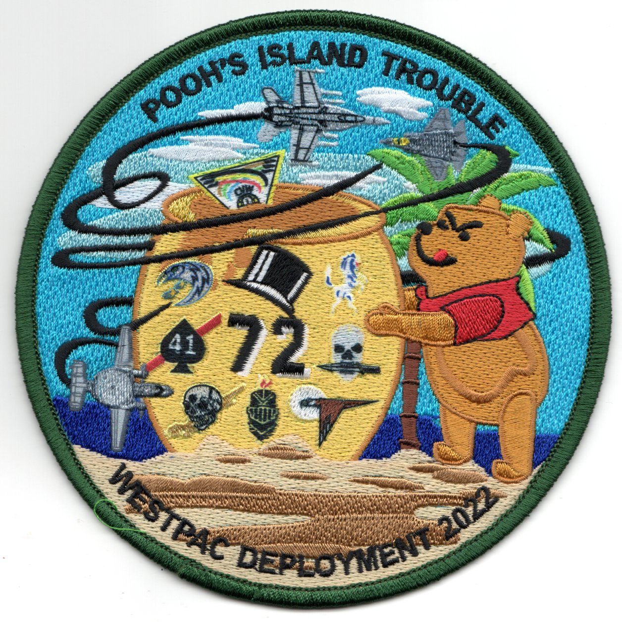 (Another AV8RSTUFF Creation): This is the large, highly detailed 2002 WestPac Deployment/Cruise patch for VFA-14 that says “POOH’S ISLAND TROUBLE” (top) and shows Winnie shaking the Honey Pot and stirring up the ‘HORNETS’, F-35s, and the E-2 Hawkeyes inside…..I’m sure there is a story behind that!! It also has the logos of all the squadrons in the Airwing, and is “sublimated” for a lot of crisp details. This patch does not come with velcro attached!