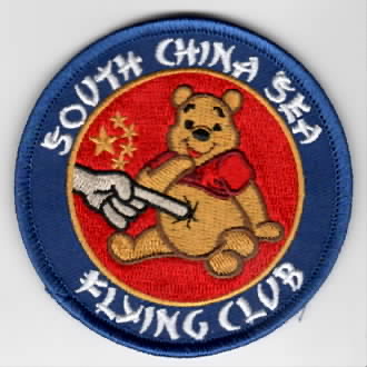 (Another AV8RSTUFF Creation): This is one of the 2023 WESTPAC cruise patches created for the VFA-14 TOPHATTERS while in Airwing Nine (CVW-9) onboard the USS Abraham Lincoln (CVN-72). It depicts the “hand of Lincoln” poking the Chinese “Bear” (looks like Winnie the Pooh), and says SOUTH CHINA SEA FLYING CLUB. This patch does not come with velcro attached!