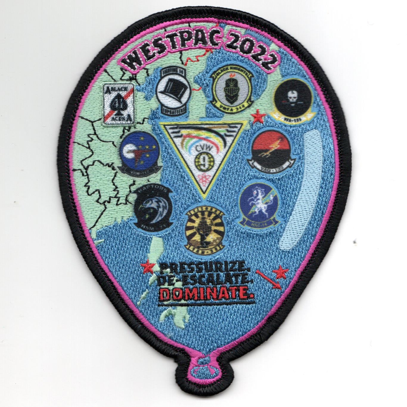 (Another AV8RSTUFF Creation): This is one of the 2022 WESTPAC cruise patches created for the squadrons in Airwing Nine (CVW-9) onboard the USS Abraham Lincoln (CVN-72). It has all the squadron logos from the nine units, says “WESTPAC 2022” (top), and “PRESSURIZE / DE-ESCALATE / DOMINATE” (bottom). This patch is more expensive than I like due to it being the “sublimated with embroidery” to get the incredible detail of the squadron logos and does not come with velcro attached!