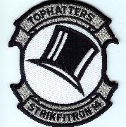 VF(A)-14 most recently participated in the Kosovo crisis as one of two Tomcat squadrons on station in the Adriatic Sea aboard the USS Roosevelt. The squadron history had them participating in Desert Storm, but have since resumed their normal Mediterranean cruises. They now fly the F/A-18F Hornet out of NAS Lemoore, CA. This version of their squadron patch has silver threading along the top and bottom.