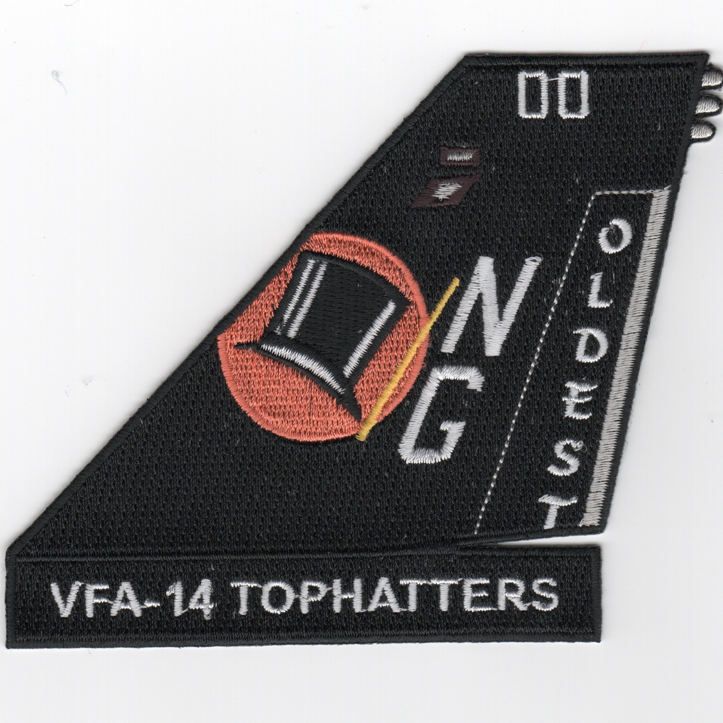 This is the tailfin for VFA-14 ‘Tophatters’ that shows that they are the “”””oldest”””” squadron in the Navy.