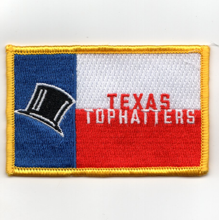 (Another AV8RSTUFF Creation): The “Tophatters” of VFA-14 from NAS Oceana flew the F-14A Tomcat and is the oldest US Navy squadron with a continuous history dating back to September 1919. They transitioned to their latest aircraft, the F/A-18 Hornet in December 2001, replacing the F-14 Tomcat. This is the TEXAS-flag version of their “TOPHATTER Flag” patch and does not have velcro attached.