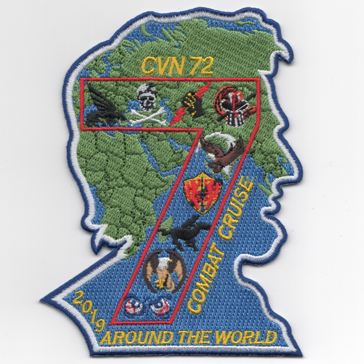 (Another AV8RSTUFF Creation): This is one of the 2019 ‘AROUND-THE-WORLD’ Cruise patches created for the VFA-143 ‘PUKIN DOGS’ to commemmorate their deployment. It is in the shape of Abrahma Lincoln’s bust (for CVN-72) and shows all the Airwing’s Squadron Logos in the ‘7’ (for CVW-7). This patch does not have velcro attached and is in VERY limited quantities!