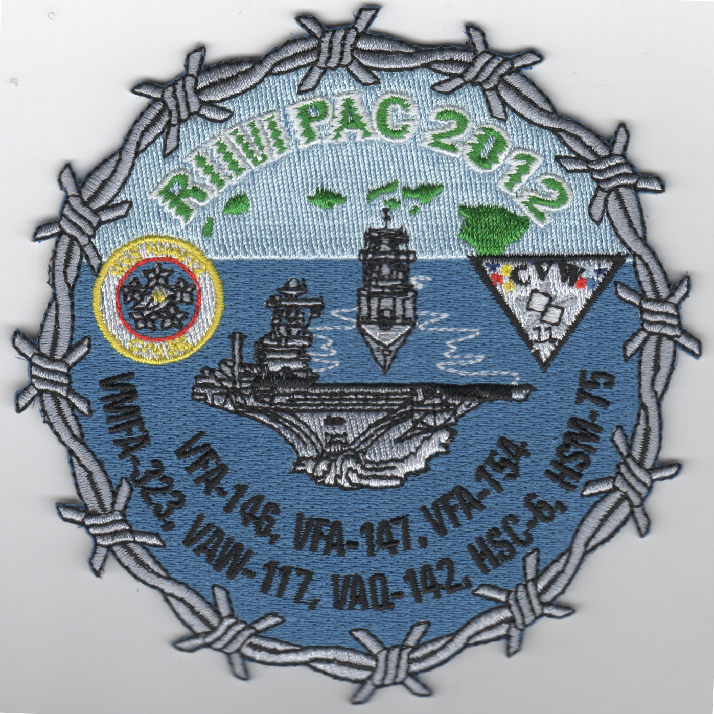 This is one of the cruise patches created for VFA-146/CVN-68/CVW-11 for their 2012 Deployment. It says “RIMPAC 2012” across the top, listing all the squadrons in the Airwing. This patch does not come with velcro attached.