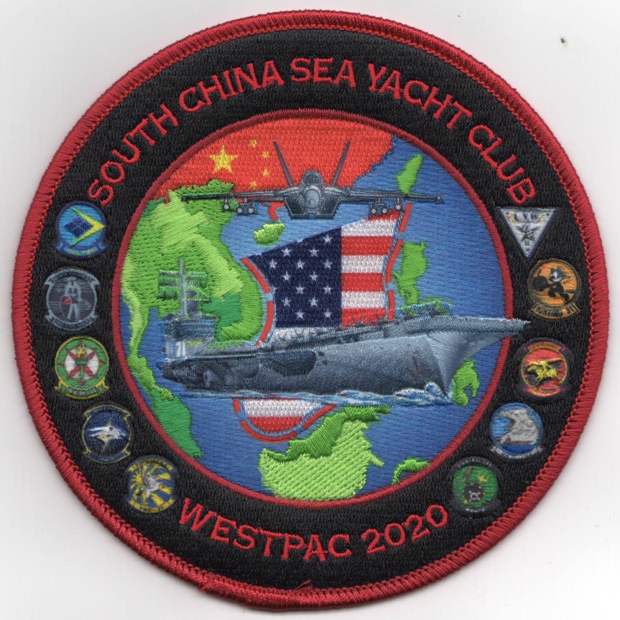 (Another AV8RSTUFF Creation): This is one of the 2020 WESTPAC cruise patches created for the VFA-146 Blue Diamonds depicting the USS Roosevelt cruising through the Asian AOR. The F/A-18 Super Hornet is also shown above the carrier. This patch is ‘sublimated’ so that all the tiny details are clear…..an incredibly detailed patch!! This patch does not have velcro attached.
