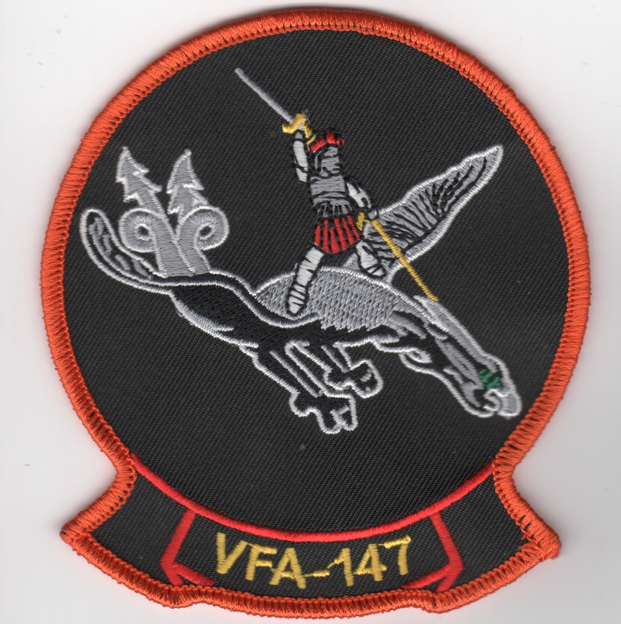 The “Argonauts” of VA-147 were the first Fleet squadron to fly the A-7A Corsair II. They were established in February 1967, and have since converted to the F/A-18E Hornet in the mid-80s as VFA-147. They currently fly the F/A-18E Hornet and this is the “Gray Man on the Gray Dragon” version of their squadron patch.