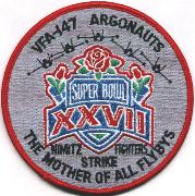 The “Argonauts” were established in February 1967, and have converted from the A-7 Corsair to the F/A-18C Hornet in the mid-80s. This is the yellow aircraft bullet from that squadron. They fly the Hornet with CVW-9 onboard the USS John C. Stennis (CVN-74). This is their commemmorative patch created when they did their 1992 “Flyover” at Super Bowl XXVII. It was dubbed “The Mother of All Flybys”.