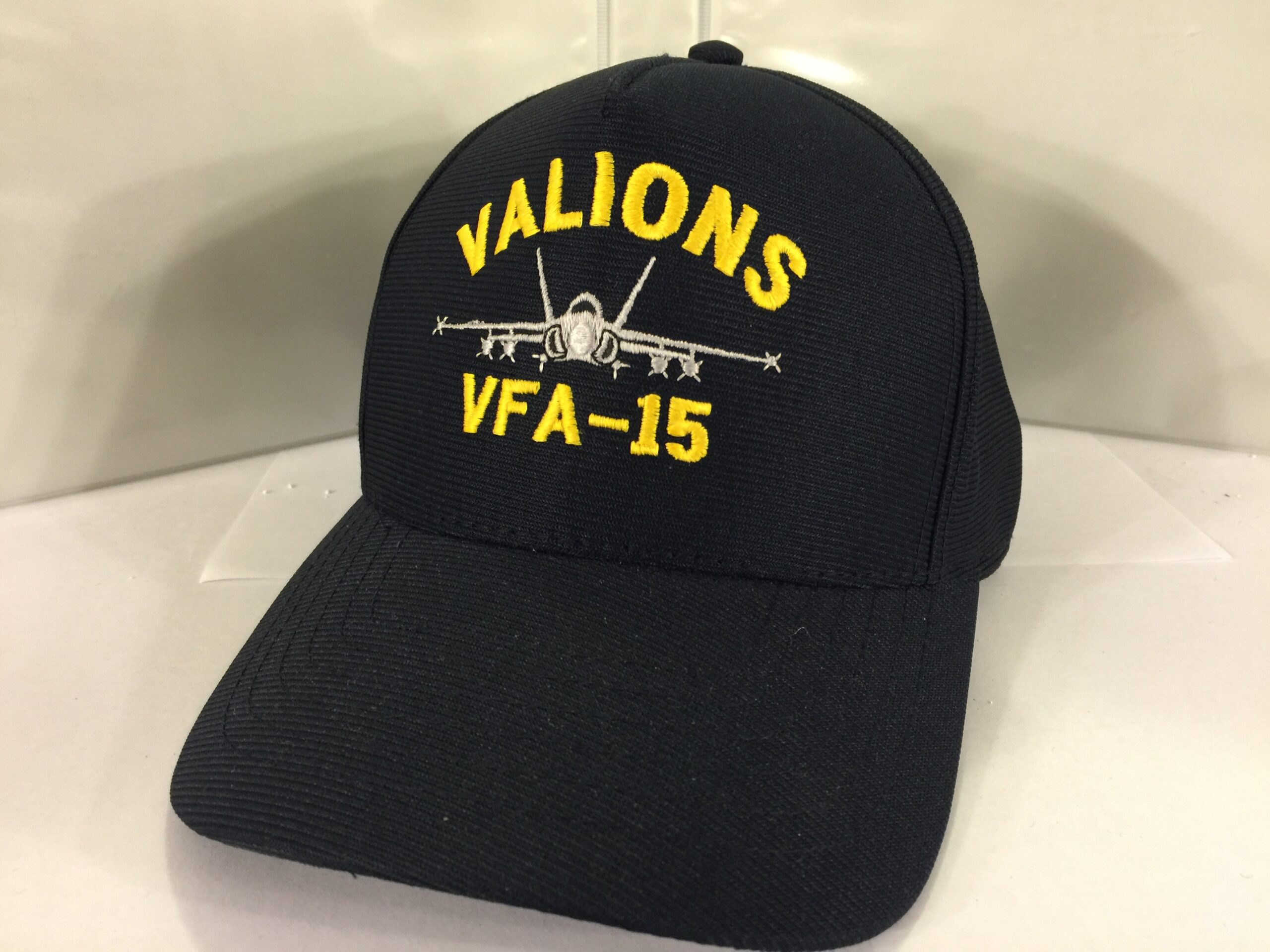 This is the dark blue version of the VFA-15 *VALIONS* Squadron Ballcap that has the front view of the F/A-18 Hornet Aircraft.