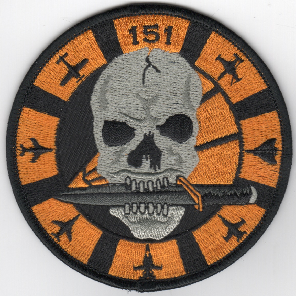 The “Vigilantes” of VFA-151 were associated with CVW-5 onboard the USS Midway, but transferred back to US soil when the USS Independence replaced the venerable Midway in 1991. They currently fly the F/A-18C Hornet out of NAS Lemoore, CA. This is another AV8RSTUFF creation of their ‘skull’ version of their “aircraft bullet” patch they wanted, showing their historical aircraft lineage, and it doesn’t have velcro attached.