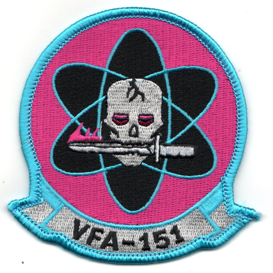 Strike Fighter Squadron One Five One (VFA-151), nicknamed the “Vigilantes” are a US NAVY F/A-18E Super Hornet fighter squadron stationed at NAS Lemoore, CA. The squadron is a part of Carrier Air Wing 9 (CVW-9). As part of CVW-9, the squadron’s tail code is NG and its radio callsign is “Ugly”. This is the ‘pink-aqua’ version of their ‘skull’ squadron patch with PINK EYES that they created and it does NOT have velcro already attached.