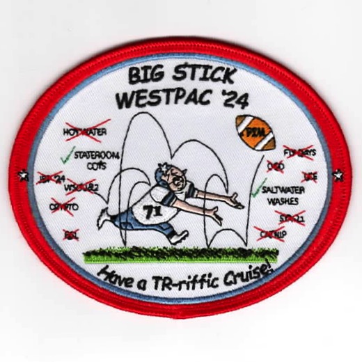 (Another AV8RSTUFF Creation): This is the 2024 Cruise patch created by the VFA-154 Black Knights in conjunction with Carrier Air Wing Eleven (CVW-11) while onboard the USS Roosevelt (CVN-71). It shows a football player trying to catch the “PIM FOOTBALL”, bouncing all over, cancelling all their Port Calls. This is an OVAL shape, has a white twill background, and does not come with velcro attached.