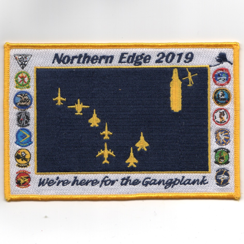 This is the rectangular version of the cruise patch for VFA-154 for their 2019 cruise attached to CVW-11 while onboard CVN-71. It lists all the squadron logos along the sides with the joint forces participating alongside the carrier. This patch does not have velcro attached.