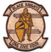 The ‘Black Knights’ of VF-154 fly the F-14A Tomcat as part of CVW-5 onboard the USS Kitty Hawk and home-based out of NAF Atsugi, Japan. The symbol on the patch shows an armored knight at parade rest with shield and sword. This was designed by a LTjg in the squadron in 1957, but then drawn by cartoonist Milton Caniff of “Steve Canyon” fame. This is the desert version they wear when over in other parts of the world.