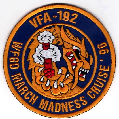 This is the 1996 March Madness Cruise patch for the VFA-192 World Famous Golden Dragons that are based out of NAS Atsugi, Japan. It was created honoring the NCAA Basketball “March Madness” as they were deployed during that time. This patch does not come with velcro attached.