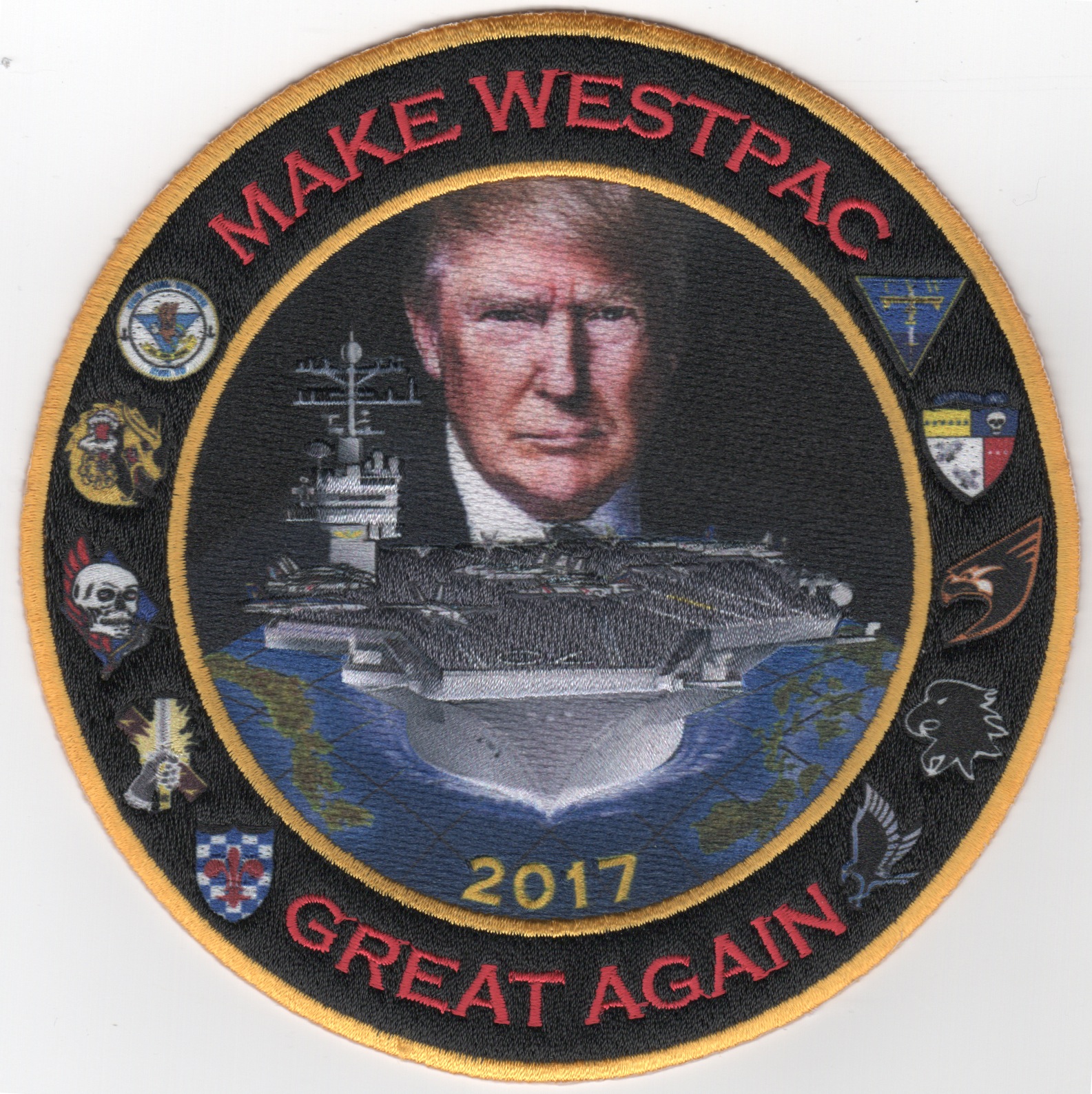 (AV8RSTUFF Creation): This is the 2017 WestPac “DOUBLE DRAGON” cruise patch created for VFA-192. The squadron NO LONGER has any of the available, as we have purchased back the few they had remaining! This patch depicts Trump, the “gaggle” of squadrons in the AirWing, CVN-70 and uses the the “HYBRID” technology means of creating patches which shows the greatest detail EVER on a patch…..pictures don’t do this patch justice!!! Get yours now while they are still 5!