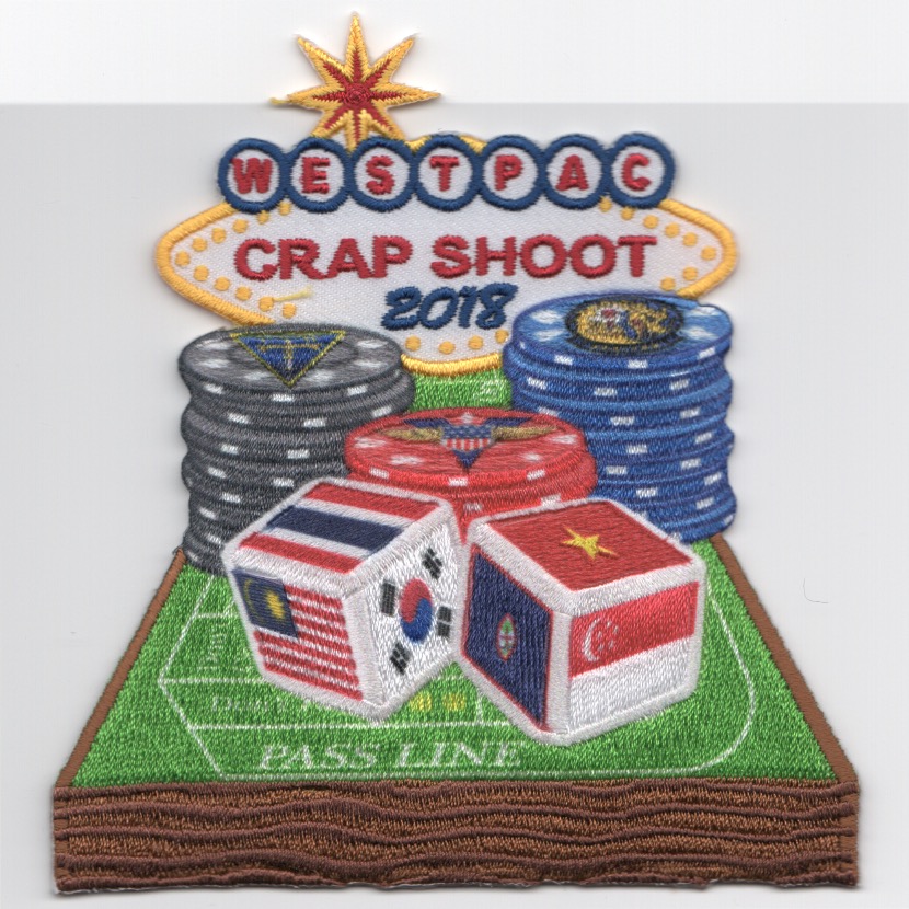 This is the 2018 WestPac “CRAP SHOOT” cruise patch created by AV8RSTUFF for VFA-192. This patch says “WESTPAC CRAP SHOOT 2018” at the top, on a Craps Table with both dice covered in flags of countries they are scheduled to (hence the “crap shoot” if they will) visit for port calls! This patch does not have velcro attached.