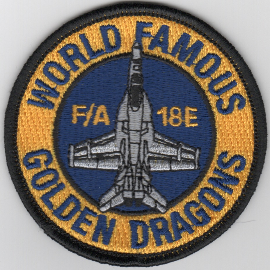 This is the round, blue/yellow version of the WFGD aircraft “bullet” patch which depicts the planform of the F/A-18E Hornet. This patch does not come with velcro attached.