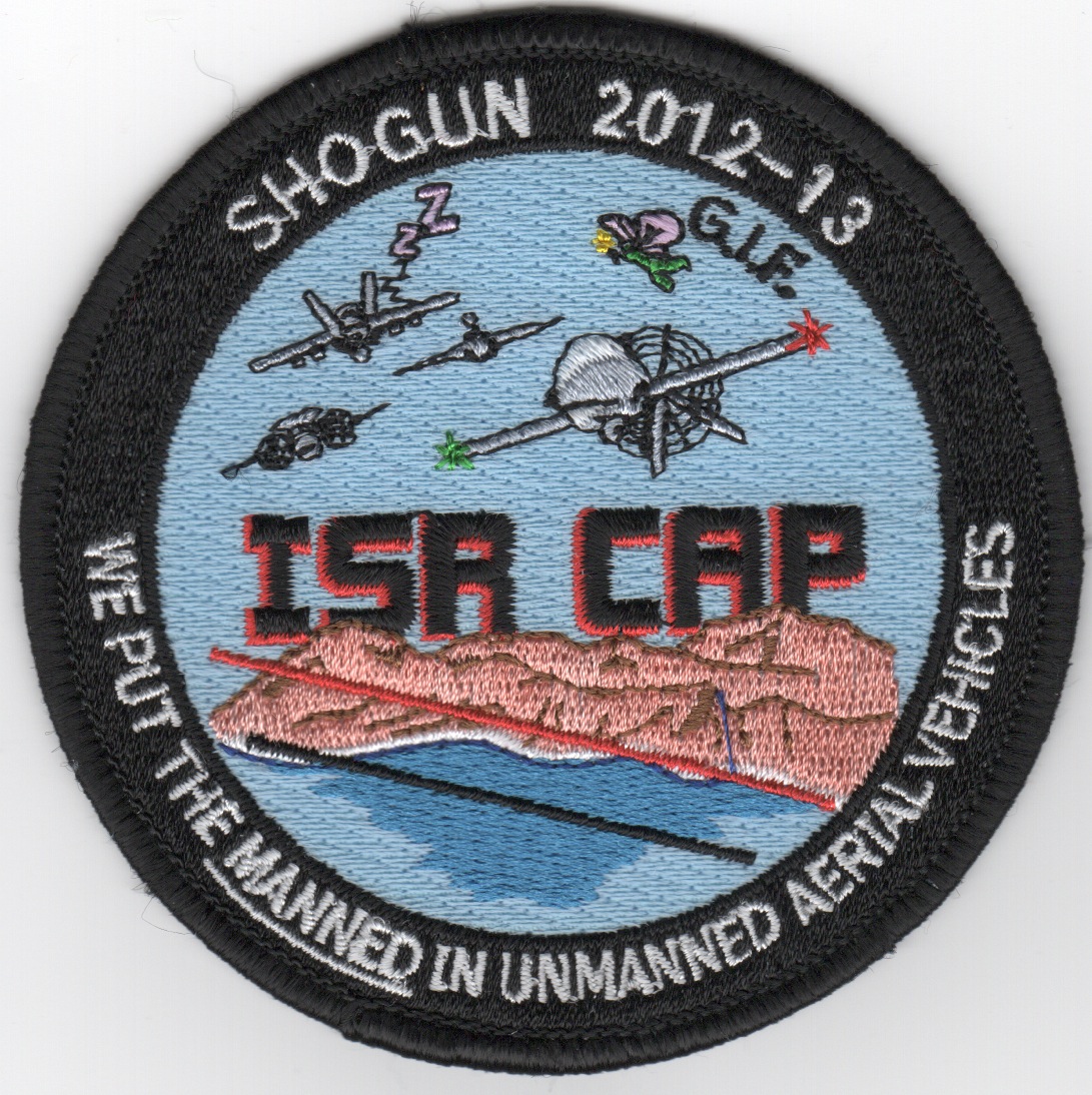 This is VFA-192’s detachment patch for their ISR CAP (Intelligence, Surveillance and Reconnaissance Carrier Air Patrol) exercise called 2012-13 SHOGUN and says “WE PUT THE MANNED IN UNMANNED AERIAL VEHICLES”…..this patch does not come with velcro attached.