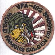 This is the round, desert version of the OSW ’98 patch, hand-made for the VFA-192 World Famous Golden Dragons that are based out of NAS Atsugi, Japan. They originally were commissioned as VF-153 in March 1945, but became VA-192 in March 1956. They flew the FJ-4B and the A-7 Corsair, but were redesignated as VFA-192 in January 1985 and acquired the F/A-18C Hornet during a ceremony at Pearl Harbor as the USS Midway was heading to retirement.