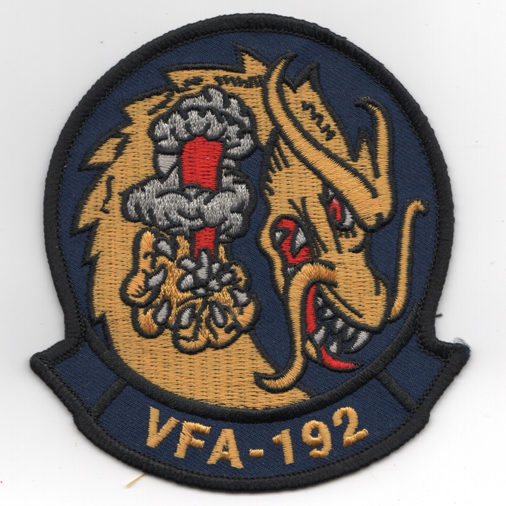 This is the color version of the squadron patch for the VFA-192 World Famous Golden Dragons that are based out of NAS Atsugi, Japan that has the “tab” across the bottom. They originally were commissioned as VF-153 in March 1945, but became VA-192 in March 1956. They flew the FJ-4B and the A-7 Corsair, but were redesignated as VFA-192 in January 1985 and acquired the F/A-18C Hornet during a ceremony at Pearl Harbor as the USS Midway was heading to retirement.