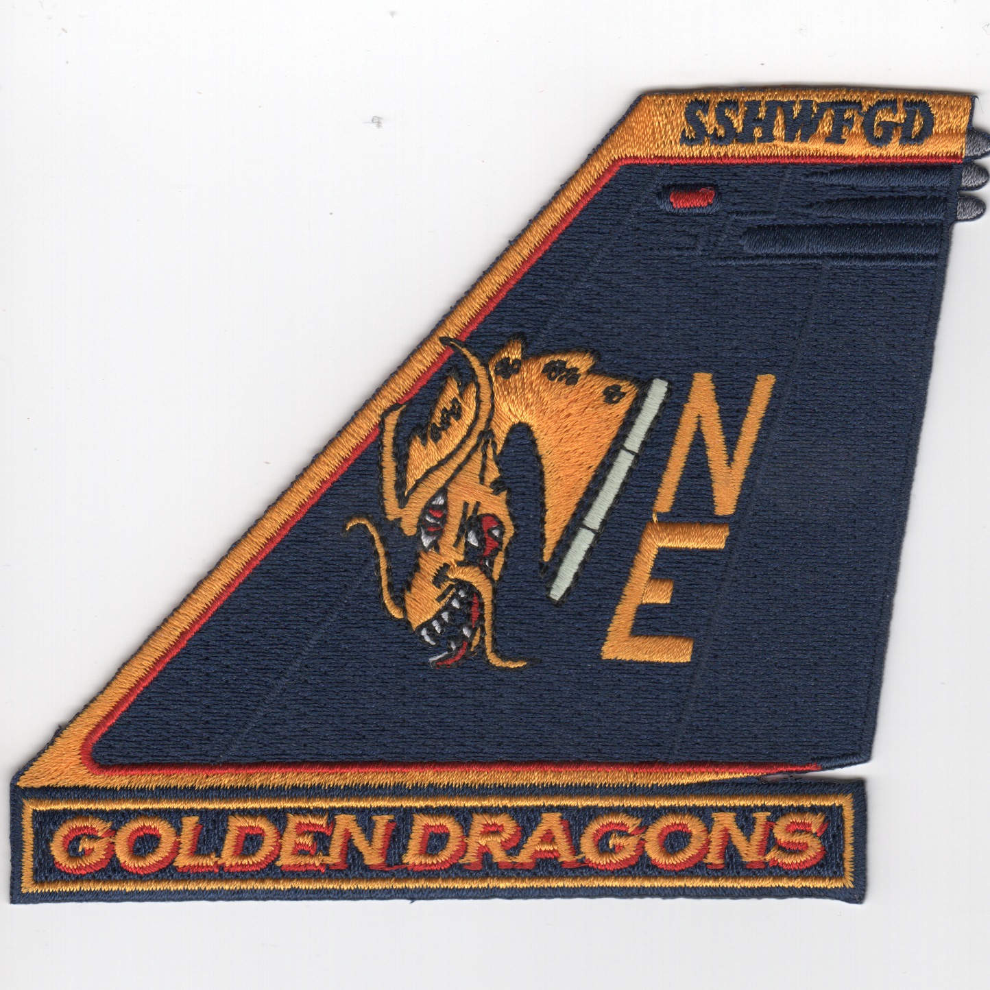 Strike Fighter Squadron 192 (VFA-192), also known as the “World Famous Golden Dragons”, are a United States Navy F/A-18E Super Hornet fighter squadron stationed at NAS Lemoore. This is their ‘SSHWFGD’ version of their tailfin patch. SSHWFGD stands for “Super Shit Hot World Famous Golden Dragons”.