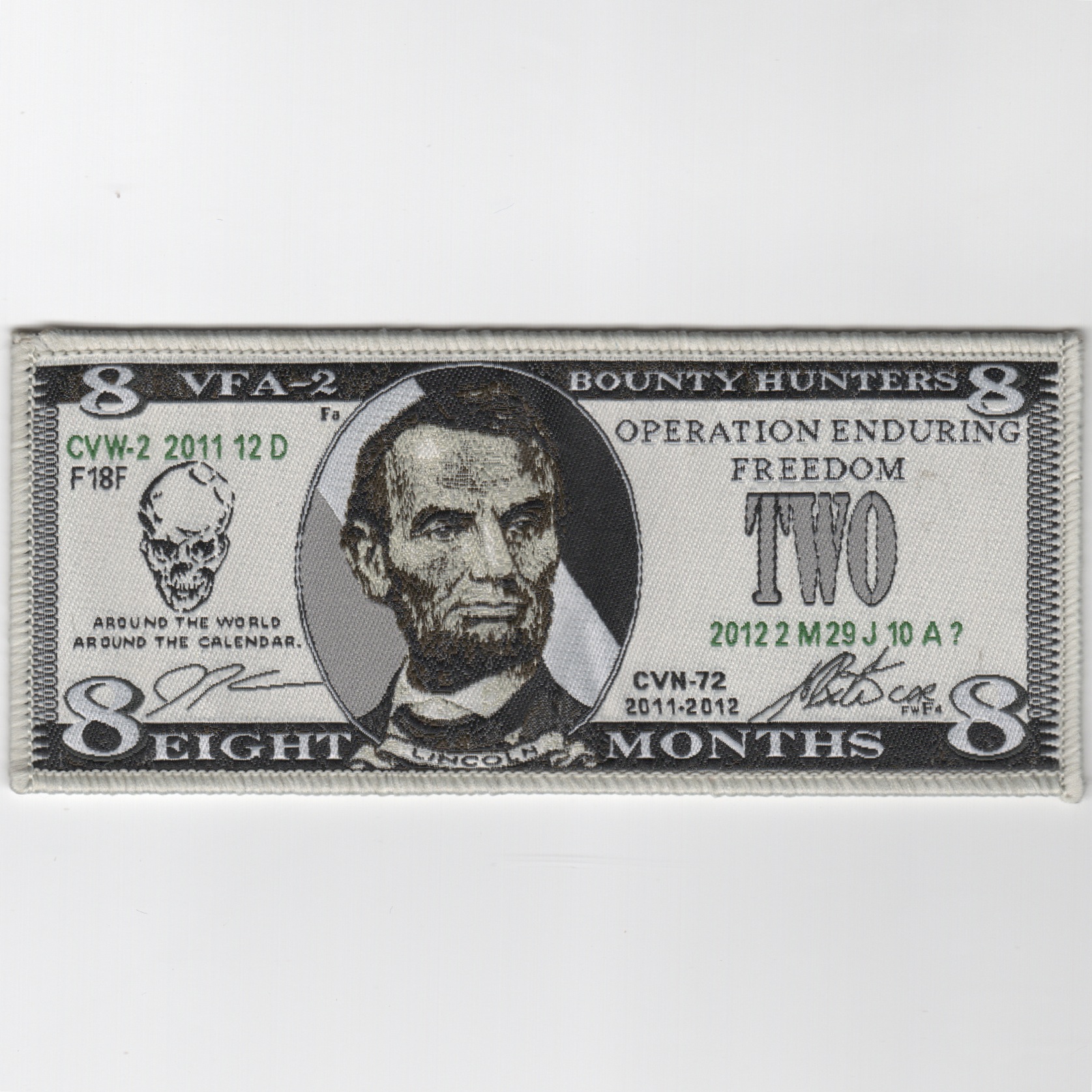 This is one of the cruise patches for VFA-2/CVN-72/CVW-2 for their 2012 “Around the World” Cruise. It is in the shape of a US dollar bill, but has 8 (for CVW-8) in the corners, with Lincoln (for CVN-72) in the middle.