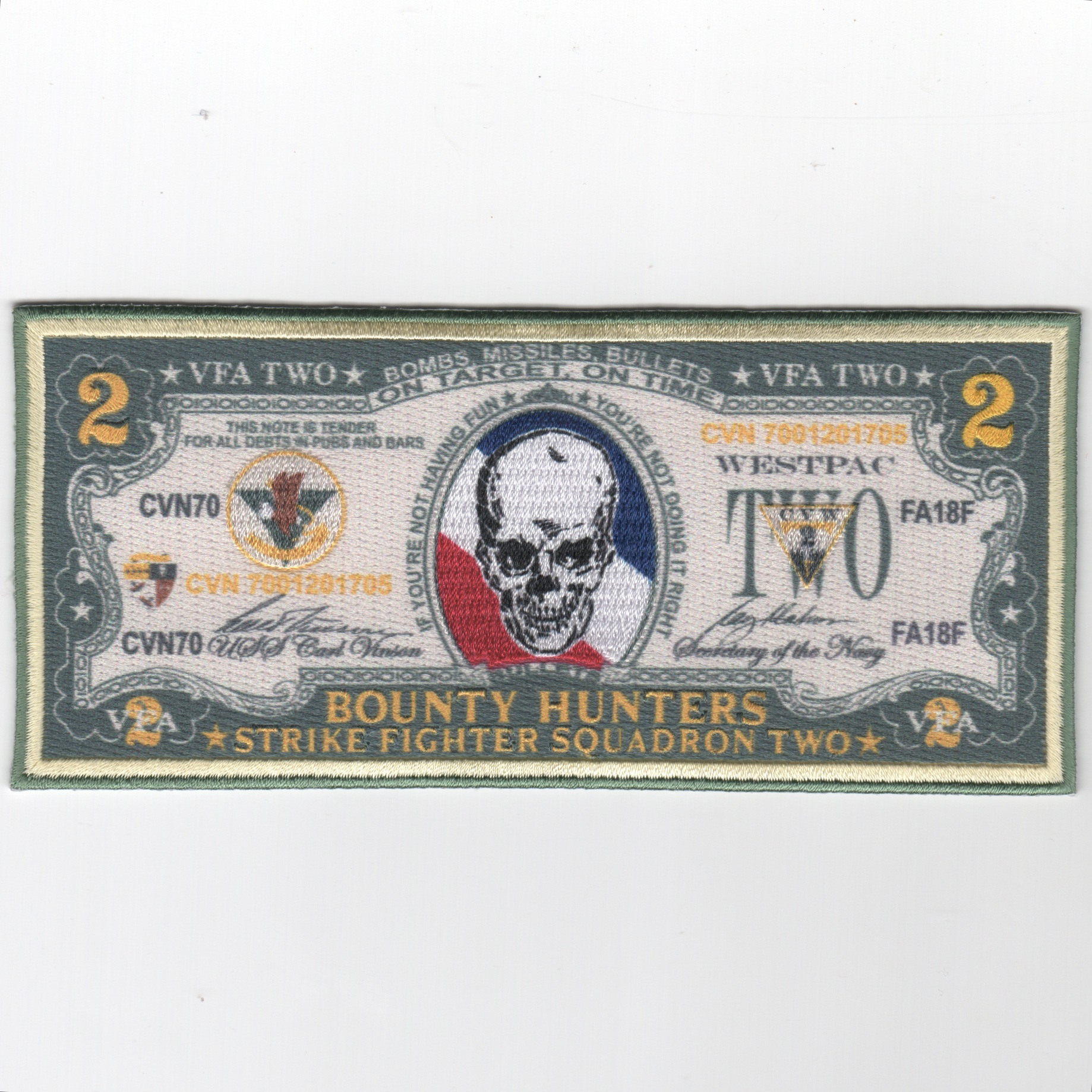 (Another AV8RSTUFF creation): THERE ARE TWO DIFFERENT $2-BILL CRUISE PATCHES!!!! This is one of the 2017 cruise patches for VFA-2/CVN-72/CVW-2 created for their Cruise. it is made with the new “hybrid” technology which allows the greatest detail ever made on a “stitched” patch. Absolutely beautiful patch and is probably going to be the first of many versions of their cruise patches! This patch does not come with velcro attached, as they are sewing these on their flight jackets and “stacking” them to show how “salty” they are. The 2018 $2-Bill cruise patch is above.