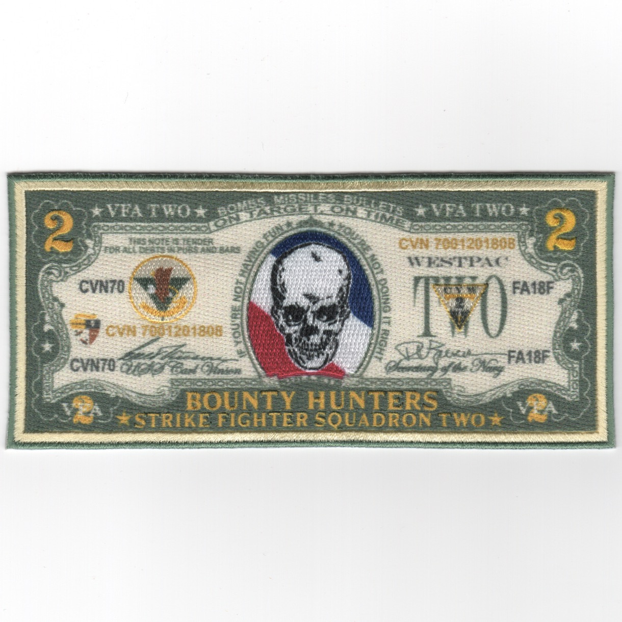 (Another AV8RSTUFF creation): THERE ARE TWO DIFFERENT $2-BILL CRUISE PATCHES!!!! This is one of the 2018 cruise patches for VFA-2/CVN-72/CVW-2 created for their Cruise. it is made with the new “hybrid” technology which allows the greatest detail ever made on a “stitched” patch. Absolutely beautiful patch and is probably going to be the first of many versions of their cruise patches! This patch does not come with velcro attached, as they are sewing these on their flight jackets and “stacking” them to show how “salty” they are. The 2017 $2-Bill cruise patch is below.