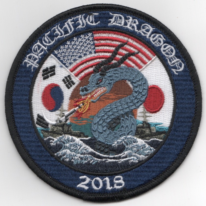 (Another AV8RSTUFF creation): This is one of the 2018 cruise patches created by VFA-2 for their deployment. It says “PACIFIC DRAGON” across the top, and shows the ‘dragon serpent’ coming out of the water similar to the “KRAKEN” of mythic tales. It has the Korean, American and Japanese flags in the background, and this patch does not come with velcro attached.