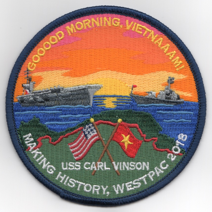 (Another AV8RSTUFF creation): This is yet another of the 2018 cruise patches for VFA-2/CVN-72/CVW-2 created for their Cruise. It is made with the new “hybrid” technology which allows the greatest detail ever made on a “stitched” patch. Absolutely beautiful patch and another of their many cruise patches for this deployment! This one was created for their port call into Vietnam, the first for a US Aircraft Carrier since the Vietnam War. Its says “GOOOOD MORNING, VIETNAAAM!!!” across the top and “MAKING HISTORY, WESTPAC 2018” along the bottom. This patch does not come with velcro attached.