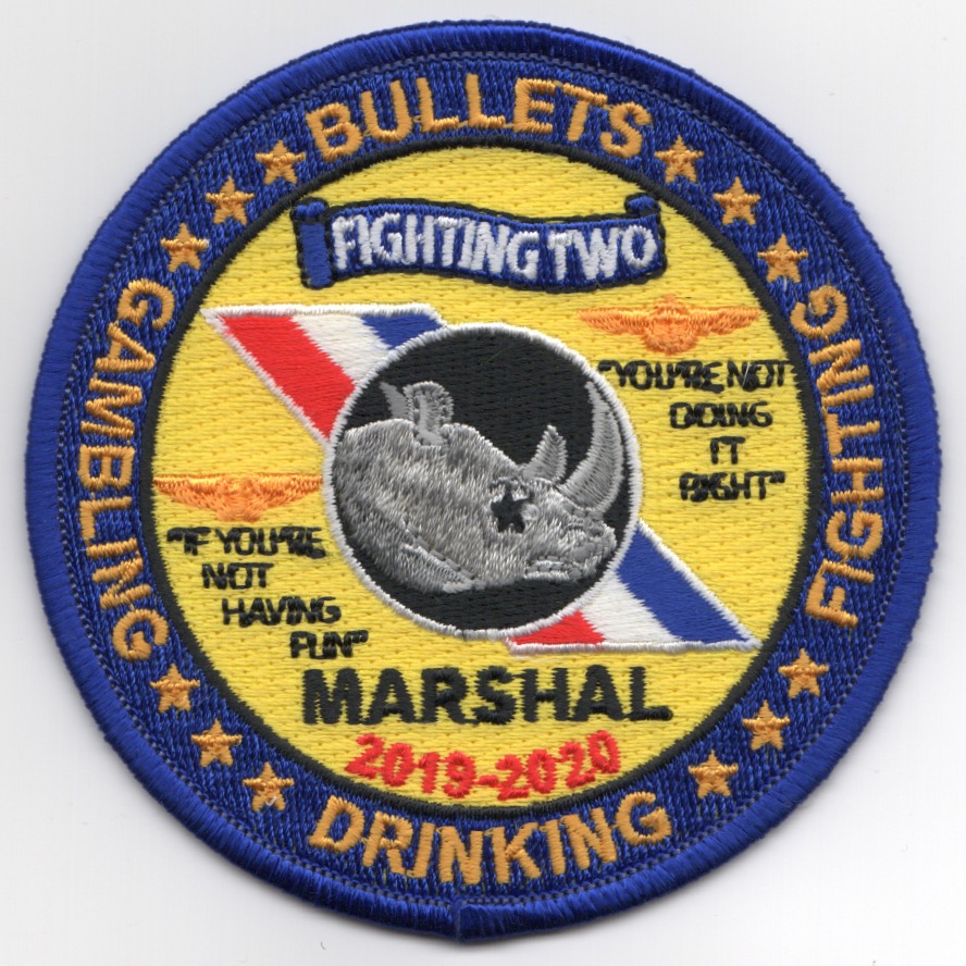 This is the VFA-2 ‘MARSHAL’ patch (with the black lettering) created for their 2019-2020 deployment. It says ‘BULLETS’ (top) with ‘GAMBLING – DRINKING – FIGHTING’ along the border. It also shows the Rhino in the middle with the saying “IF YOU’RE NOT HAVING FUN, YOU’RE NOT DOING IT RIGHT”. This patch does not come with velcro attached.