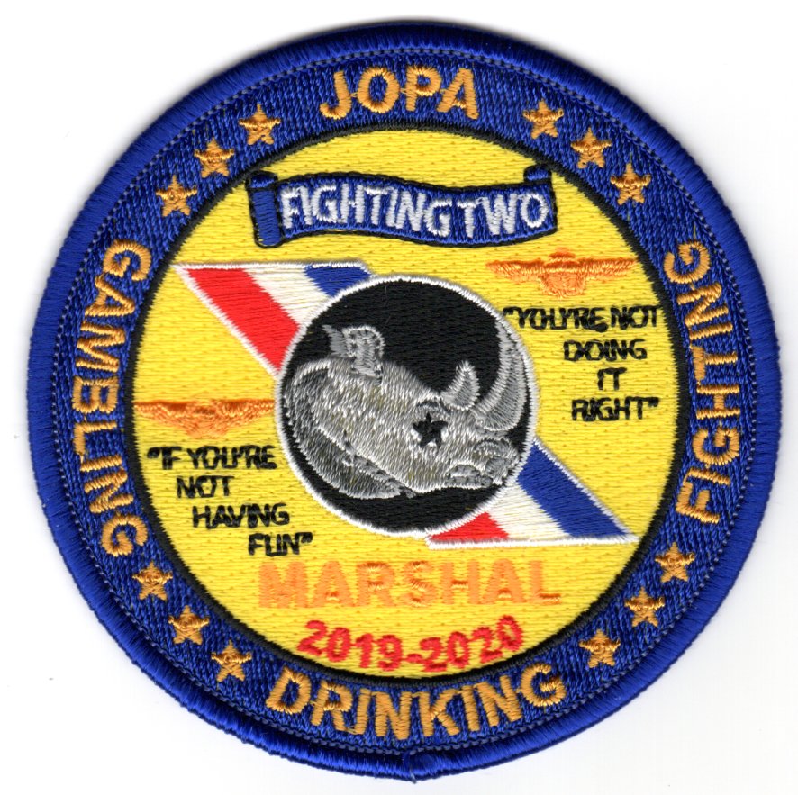 This is the VFA-2 ‘MARSHAL’ patch (with the yellow lettering) created for their 2019-2020 deployment. It says ‘BULLETS’ (top) with ‘GAMBLING – DRINKING – FIGHTING’ along the border and ‘JOPA’ along the top. It also shows the Rhino in the middle with the saying “IF YOU’RE NOT HAVING FUN, YOU’RE NOT DOING IT RIGHT”. This patch does not come with velcro attached.