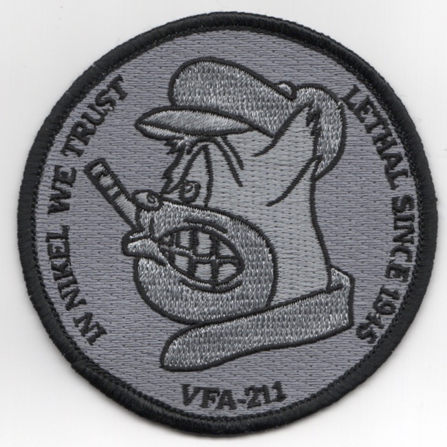 This patch was created for VFA-211 that says “IN NIKEL WE TRUST – LETHAL SINCE 1945”. I have no idea who this salty Chief is (assumption), but looks like one I wouldn’t mess with!! What a great tribute by his sailors! This patch does not have velcro attached.