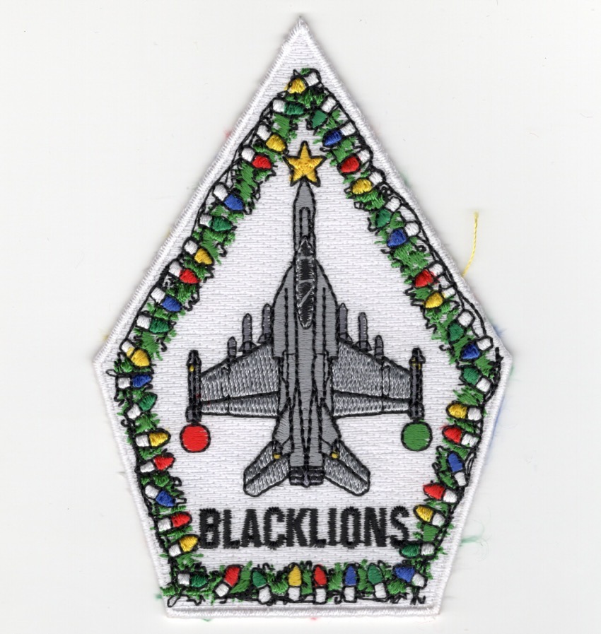The “Black Lions” of VFA-213 first flew F-4B Phantoms for many years, then were transitioned to the F-14A Tomcat, and have since transitioned to the F/A-18 Hornet. The squadron embarked on their first Tomcat cruise as part of CVW-11 onboard the USS Kitty Hawk (CV-63) in October 1977, and their last Tomcat cruise in late 2005/early 2006. They were one of two F-14 Tomcat squadrons during the final Tomcat cruise (VF-31 was the other). They now fly the F/A-18 Hornet and this is the “CHRISTMAS” version of their Hornet COFFIN patch and does not come with velcro attached.