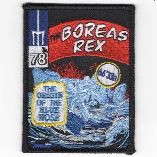 This is the rectangular version of the VFA-213 *BOREAS REX / Origin of the Blue Nose* Cruise patch created for the members of Carrier Air Wing Eight (CVW-8) onboard the USS Ford (CVN-78). This patch says “THE BOREAS REX” (top), “The ORIGIN of the BLUE NOSE (bottom), and does not come with velcro attached.