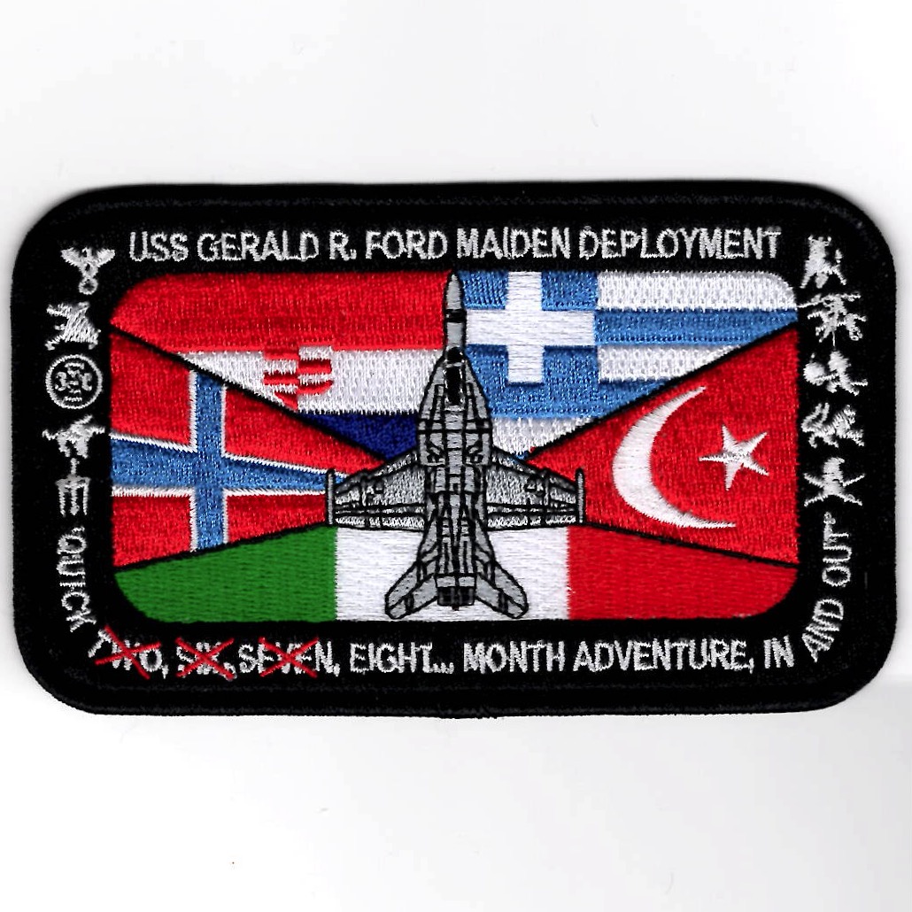 This patch was created for VFA-31 / VFA-37 / VFA-87 / VFA-213 for their tribute to the USS Gerald Ford (CVN-78)’s 2023 “MAIDEN VOYAGE”. USS Gerald R. Ford (CVN-78) is an aircraft carrier for the US Navy and the lead ship of her class. The ship is named after the 38th President of the United States, Gerald Ford, whose World War II naval service included combat duty aboard the light aircraft carrier Monterey in the Pacific Theater. This patch says “QUICK TWO, SIX, SEVEN, EIGHT…MONTH ADVENTURE, IN AND OUT” (bottom) and does not come with velcro attached.