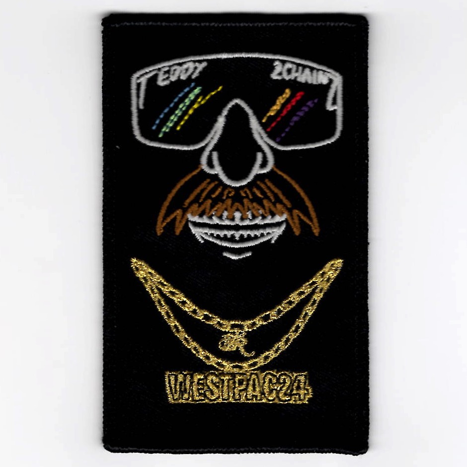 (Another AV8RSTUFF Creation): This is the patch created by the squadron for their 2024 WestPac Deployment. It shows “”””The Dude”””” in shades with “”””TEDDY 2 CHAINS”””” at the top of the sunglasses. He’s wearing a gold necklace that says WESTPAC24 and does not have velcro attached.
