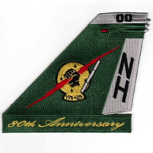 (Another AV8RSTUFF Creation): This is the GREEN version with *CURSIVE LETTERS* at the bottom of the tailfin for VFA-25 that says ’80th Anniversary’. It depicts the “”””FIST”””” holding a lightning bolt and does not come with velcro attached.